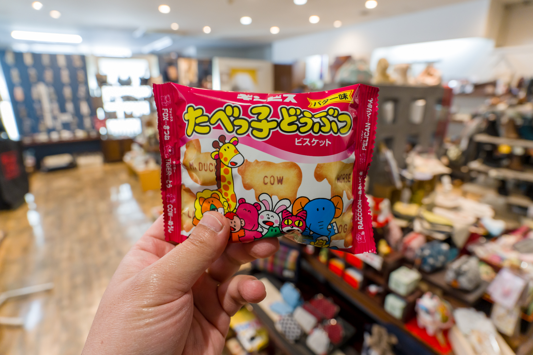 当然こういう小物も用意してきたわけです。劇中で店主が康一にしきりに勧めてきた「たべっ子どうぶつ」。