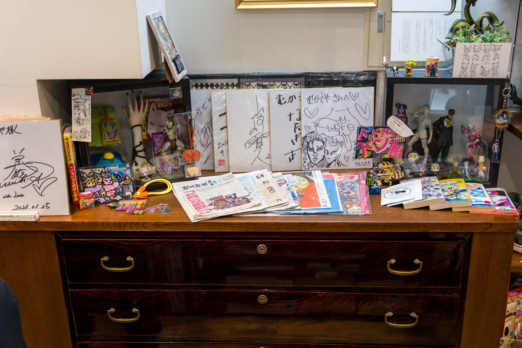 レジ奥にはさらに大量のジョジョグッズや訪店した有名人のサイン色紙が!