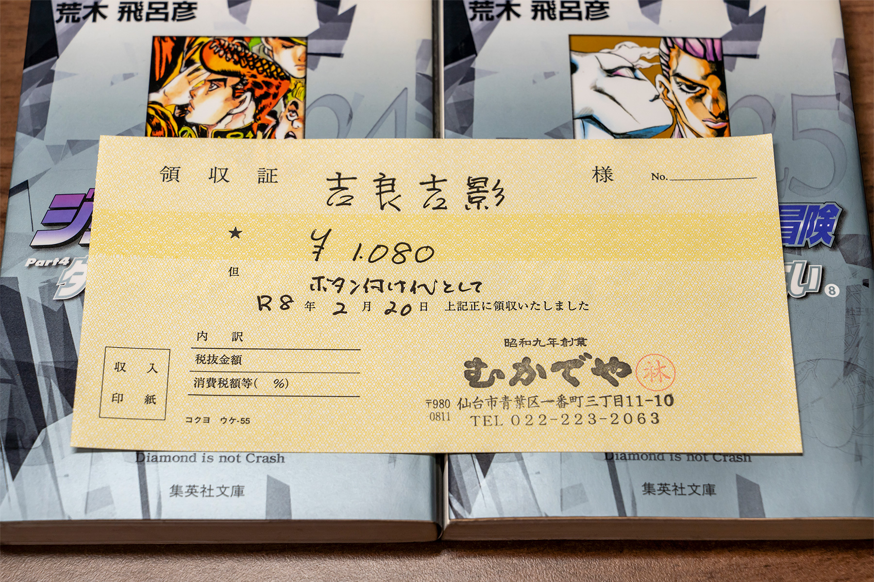 ちなみに劇中で吉良吉影が領収証を受け取るシーンは特にないのですが、私が知る限りではジョジョ立ちのカジポン氏が初出でそこからファンの間で広まったものだと思います。何を買っても「ボタン付け代として」と書かれ、値段と日付には実際のものが記入されるというのが唯一無二かつ本物の聖地巡礼証という感じでとても嬉しい。大事にします。