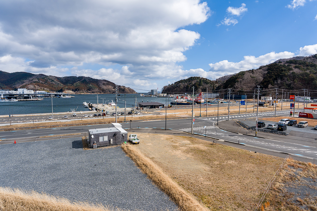 劇中で五郎が被災者に黙祷を捧げていた場所からの現在の眺望。ここは駅から徒歩数分、女川町地域医療センターの駐車場です。高台にある病院にも関わらず当時はここにまで津波が押し寄せたとのこと。