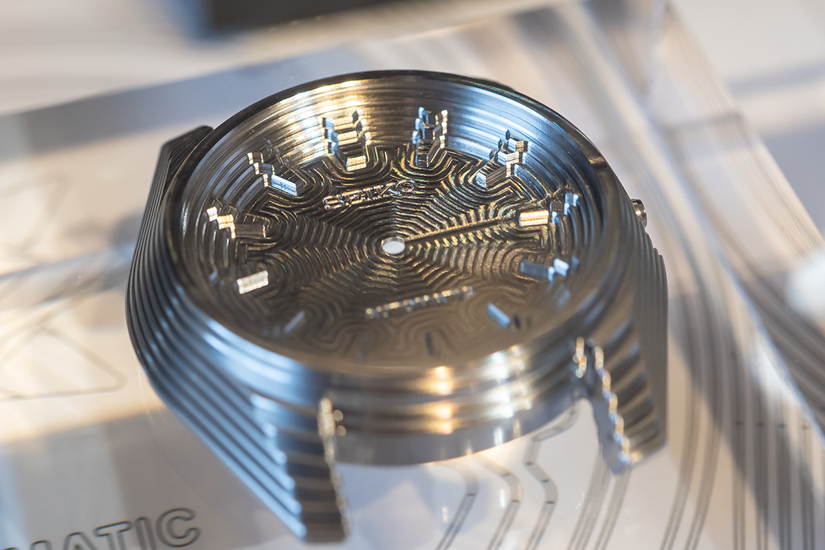 CNCの刃が通った跡を文字盤の模様として生かしています。またケース自体にもあえて段差をつけた切削を行うことで、金属の質感や機械らしさを前面に表現したデザイン。金属フェチとしてはあらゆる角度からいつまでも見ていられるし、撫でたり愛でたりしたくなるところ。見ているだけで呼吸が荒くなります。