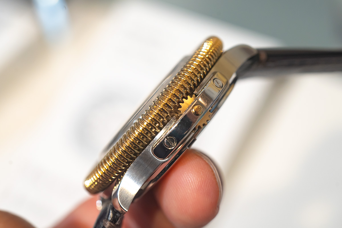 ベゼルの凹凸が歯車型のりゅうずと咬み合うことでゼンマイが巻かれる仕組み。りゅうずを一段引き上げるとベゼル回転で時刻合わせもできます。