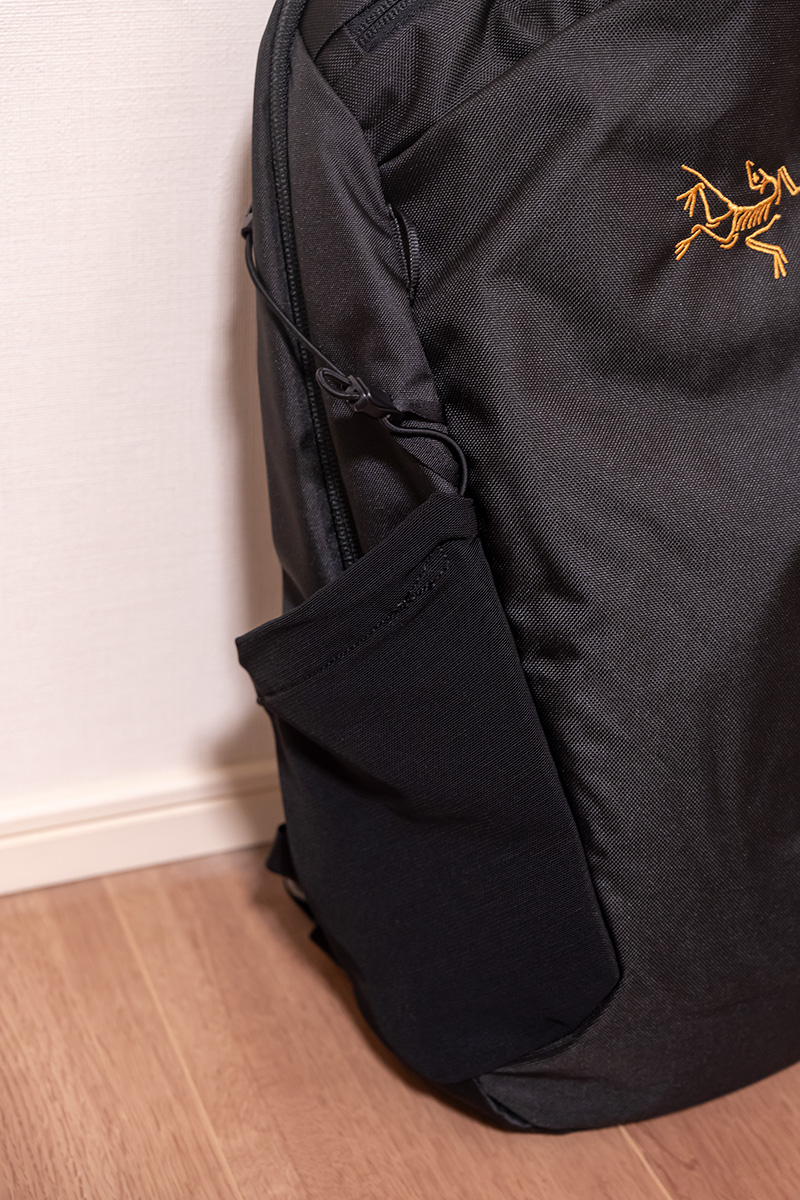 両側面には伸縮素材のポケットを備え、ここにペットボトル等のドリンクを挿して歩けます。また荷物が少ないときは側面のドローコードを締めてバックパック自体を薄くできたり、カラビナやバンジーコードを引っ掛けておけるハードポイントが各所に設けられたりしていて見た目はプレーンなのに多機能なのが助かる。