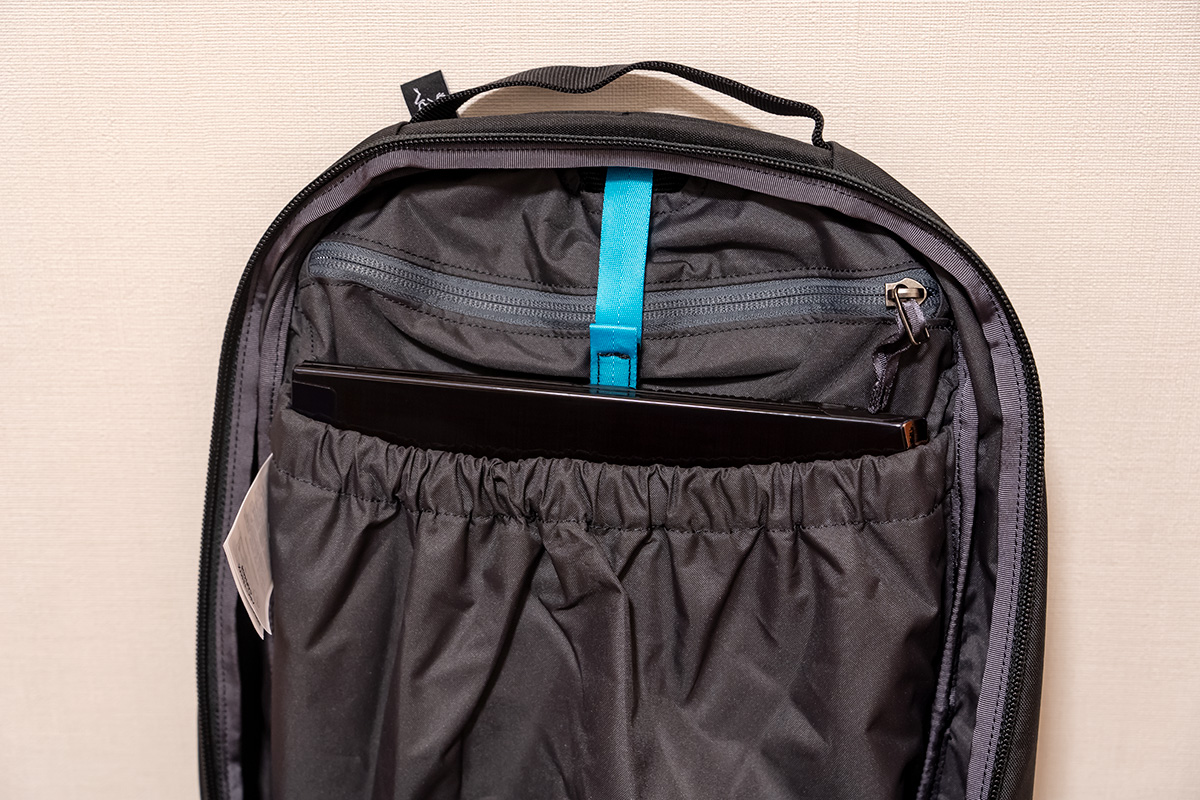 ちなみに中央にぶら下がっているターコイズ色のベルトは何かと思ったら、ハイドレーション(登山用の給水パック)のチューブを保持するためのもののようですね。タウンユース主眼のバックパックに見えながらもガチ用途向けに作ってあります。