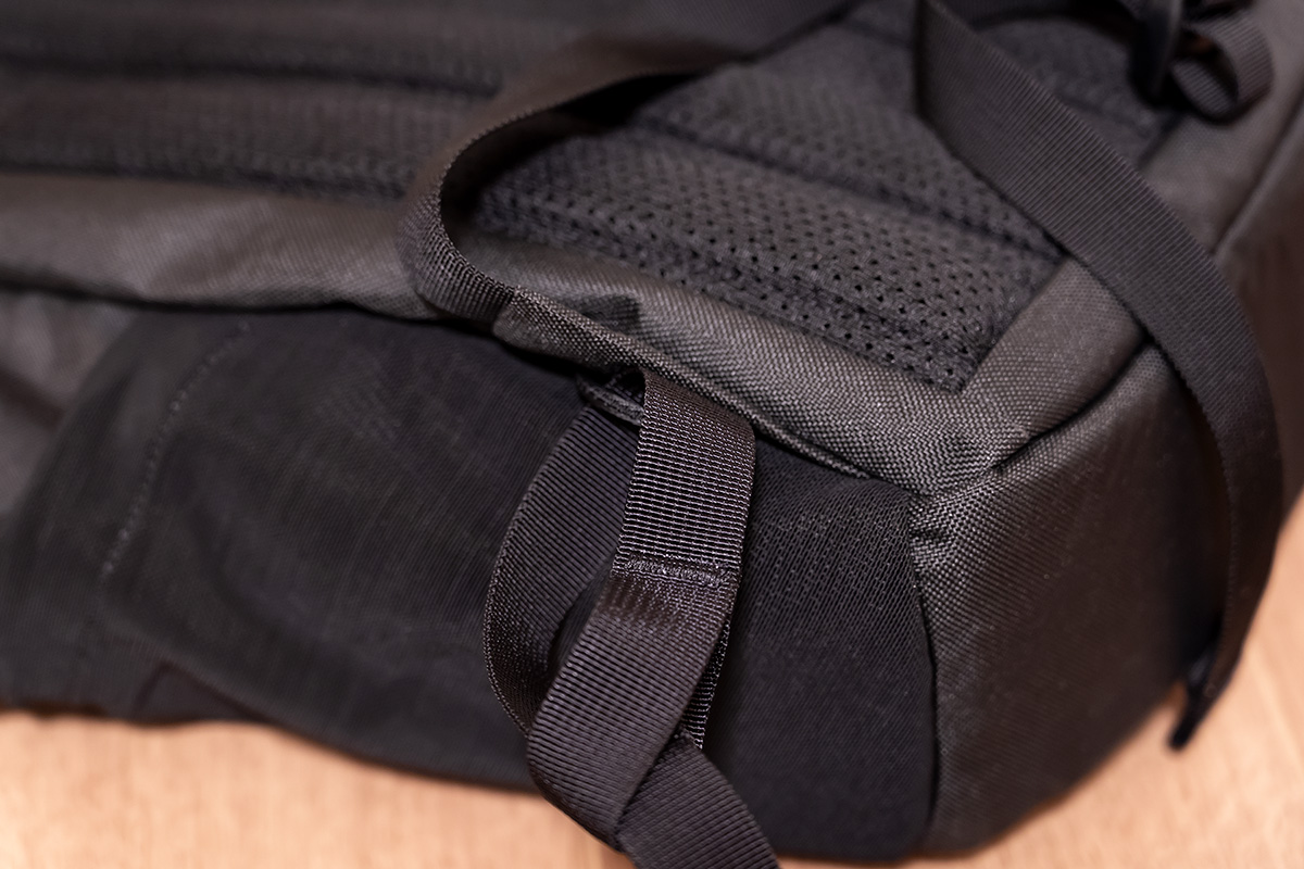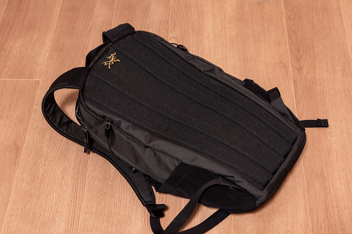 背面にはハードタイプのパネルが仕込まれていて型崩れしにくい。またメッシュ生地で通気性良く、背骨に沿う形で薄手のクッションが入っているから背中への負担も少なめ。最低限のクッション性や快適性を確保しながらできるだけ薄く軽く作ったのが伝わってくるバックパックで、まさに日常使いに「ちょうど良い」作りだと感じます。