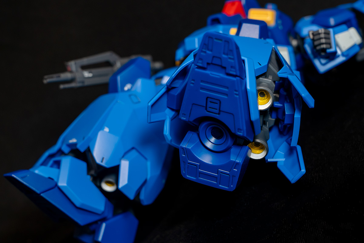 グスタフ・カールは映像作品としては『ガンダムUC』で先行配備型がシャイアン基地の哨戒にあたっていたのが初出で、その後『NT』にも登場。当時の機体(13型)はロービジっぽいグレー系の配色で、鮮やかブルーな00型よりも個人的にはあっちが好きでした。00型がこんなにビビッドな青なのは、ダバオ(フィリピン)やオーストラリアといった海が近いエリアでのロービジ性を意識してのことなんでしょうかね。