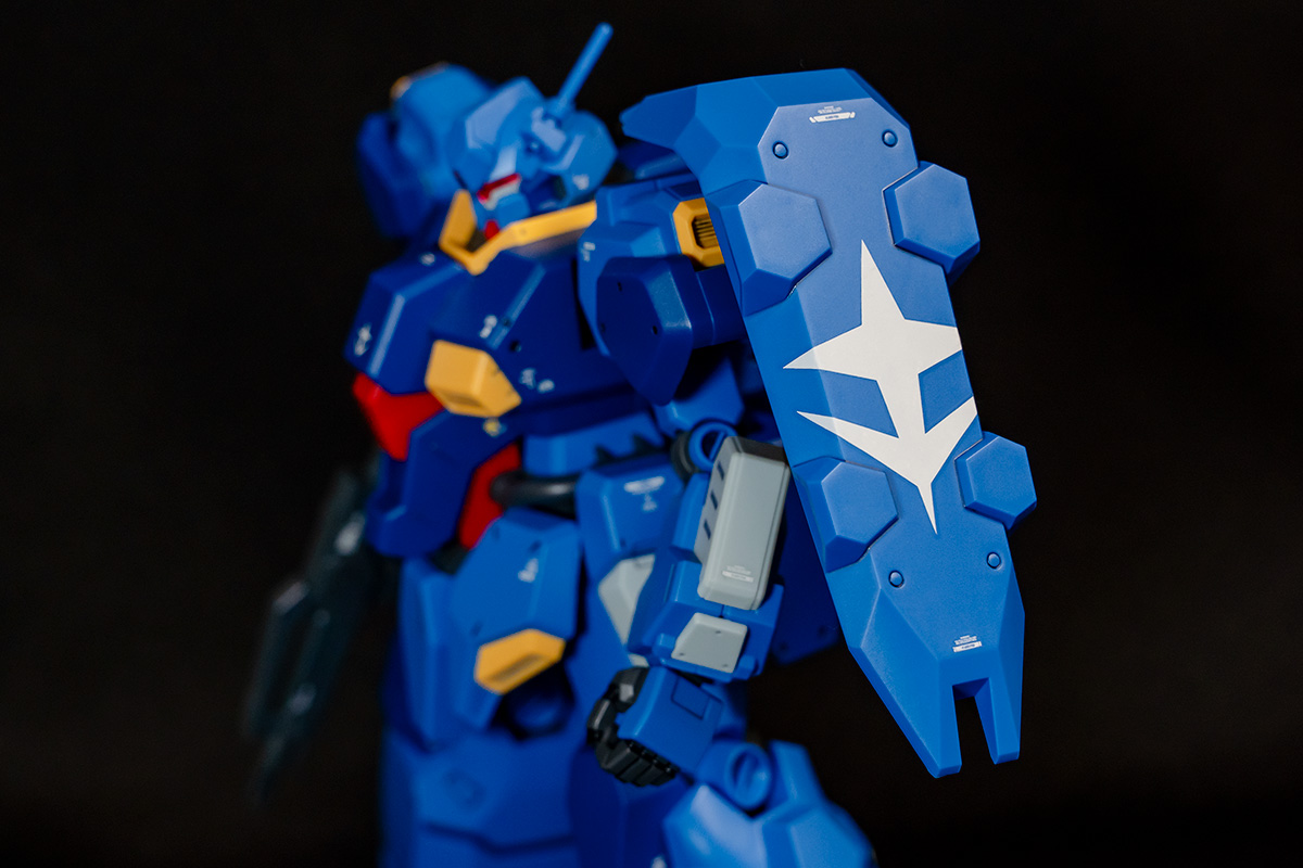 左肩にはフレキシブルアーム経由で大型のシールドを装備。連邦軍のシンボルマークが大々的に記されているのが目を引きます。